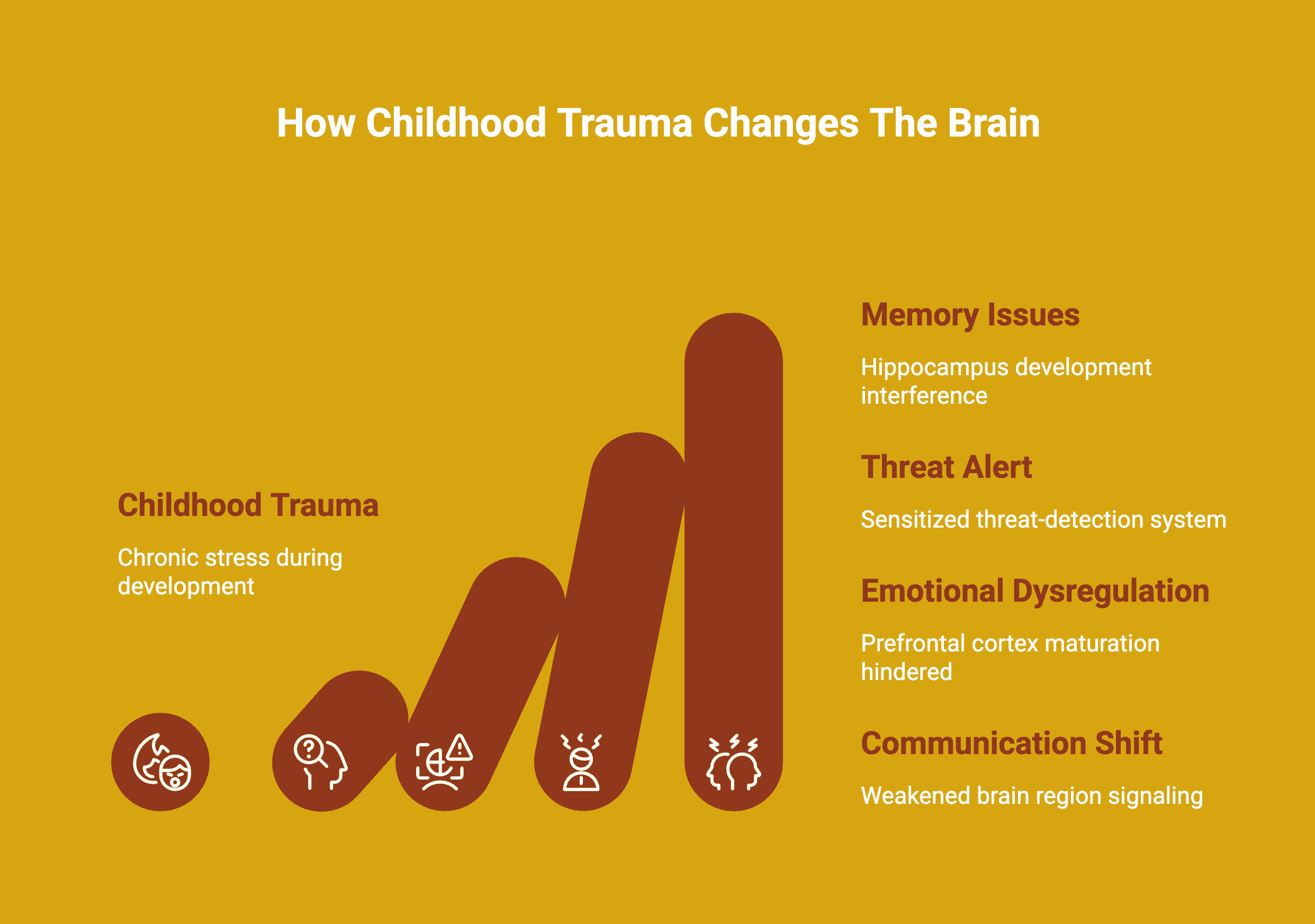 Trauma can affect brain areas responsible for calming and regulating emotions, including parts of the prefrontal cortex. When stress dominates early development, these systems may have fewer opportunities to mature fully.