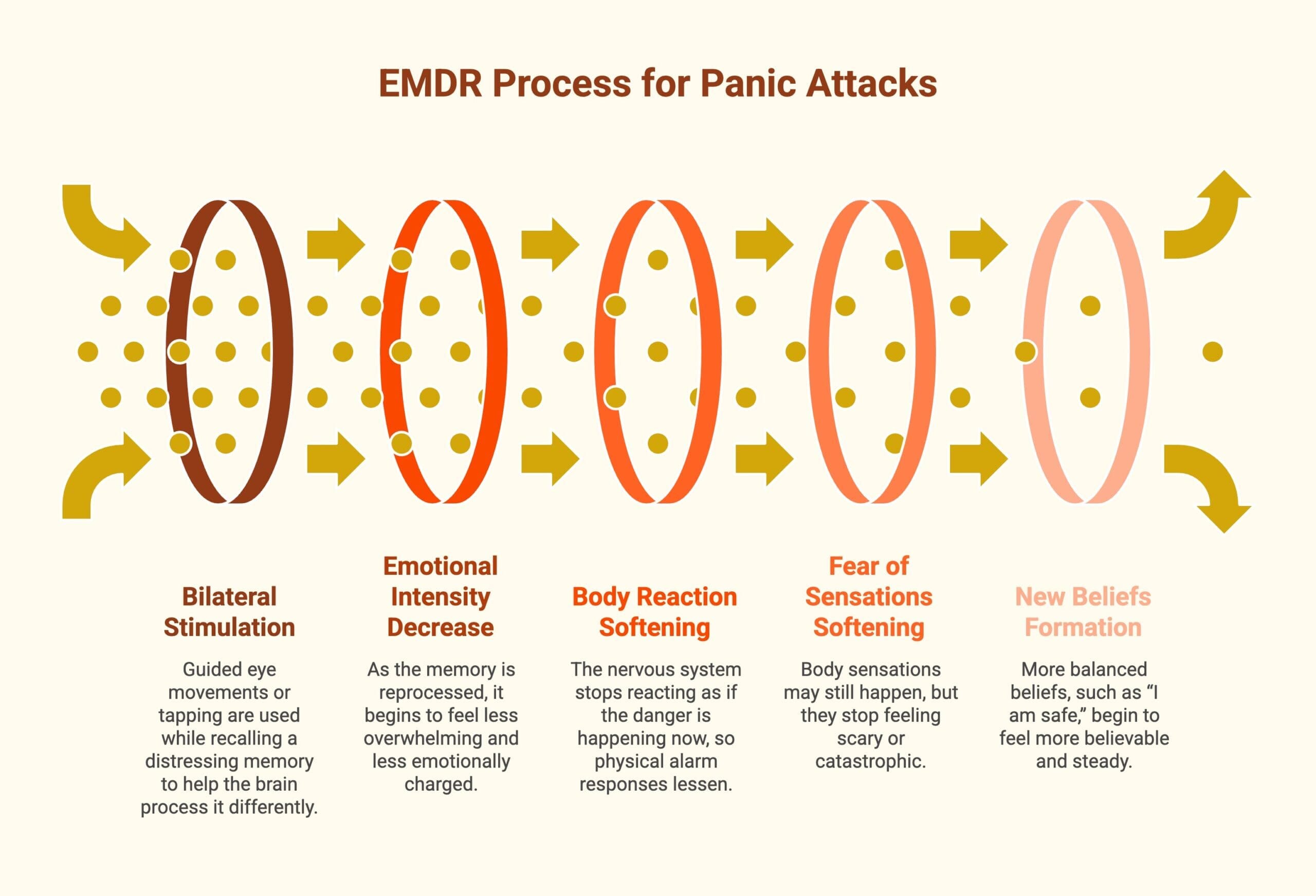 EMDR helps the brain reprocess memories linked to fear responses. When earlier panic experiences are processed safely, the brain updates how it interprets similar sensations, reducing automatic panic reactions.