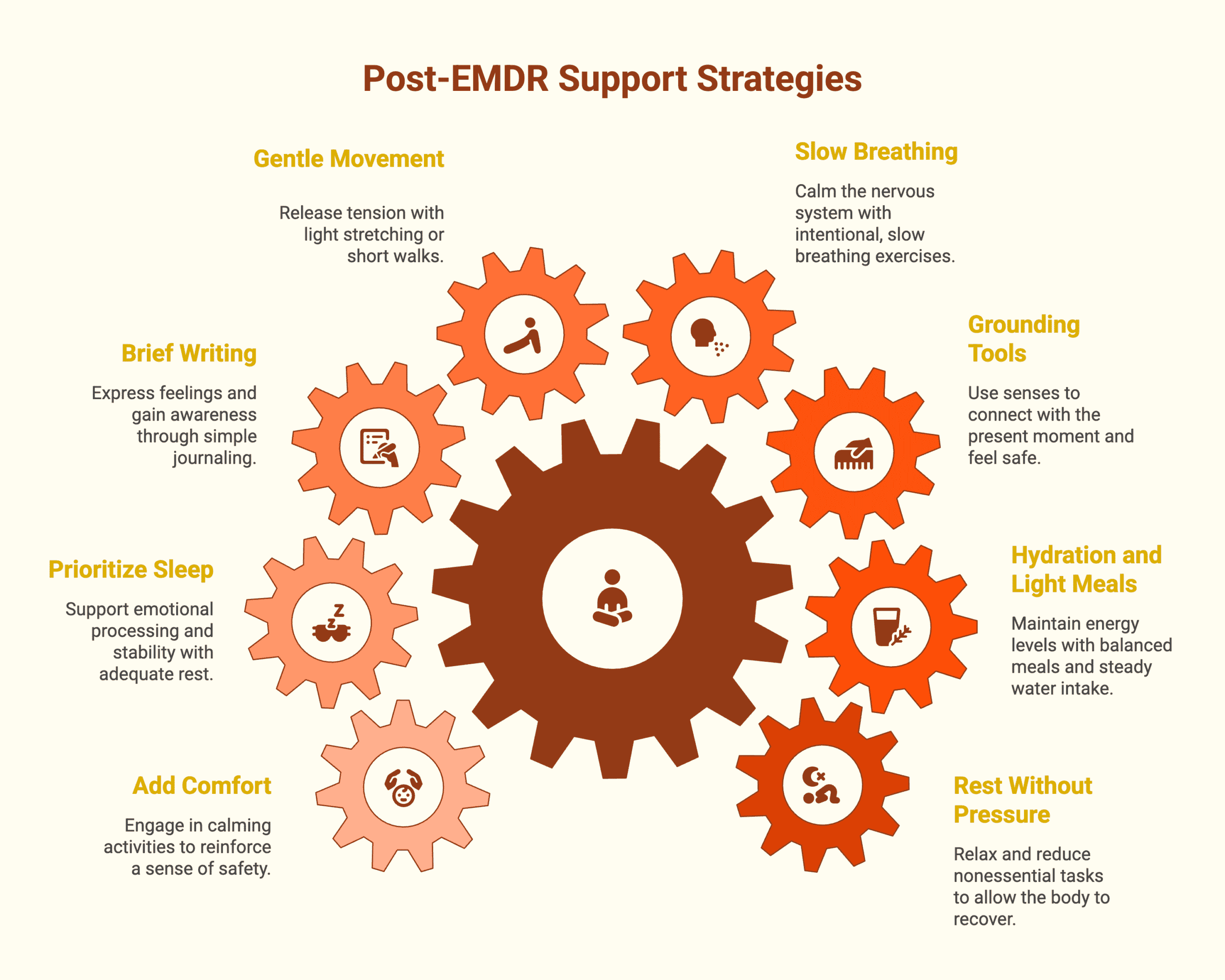 After EMDR, your nervous system may remain active for a period of time. These suggestions are meant to support regulation gently. Choose what feels manageable rather than trying to follow every step.