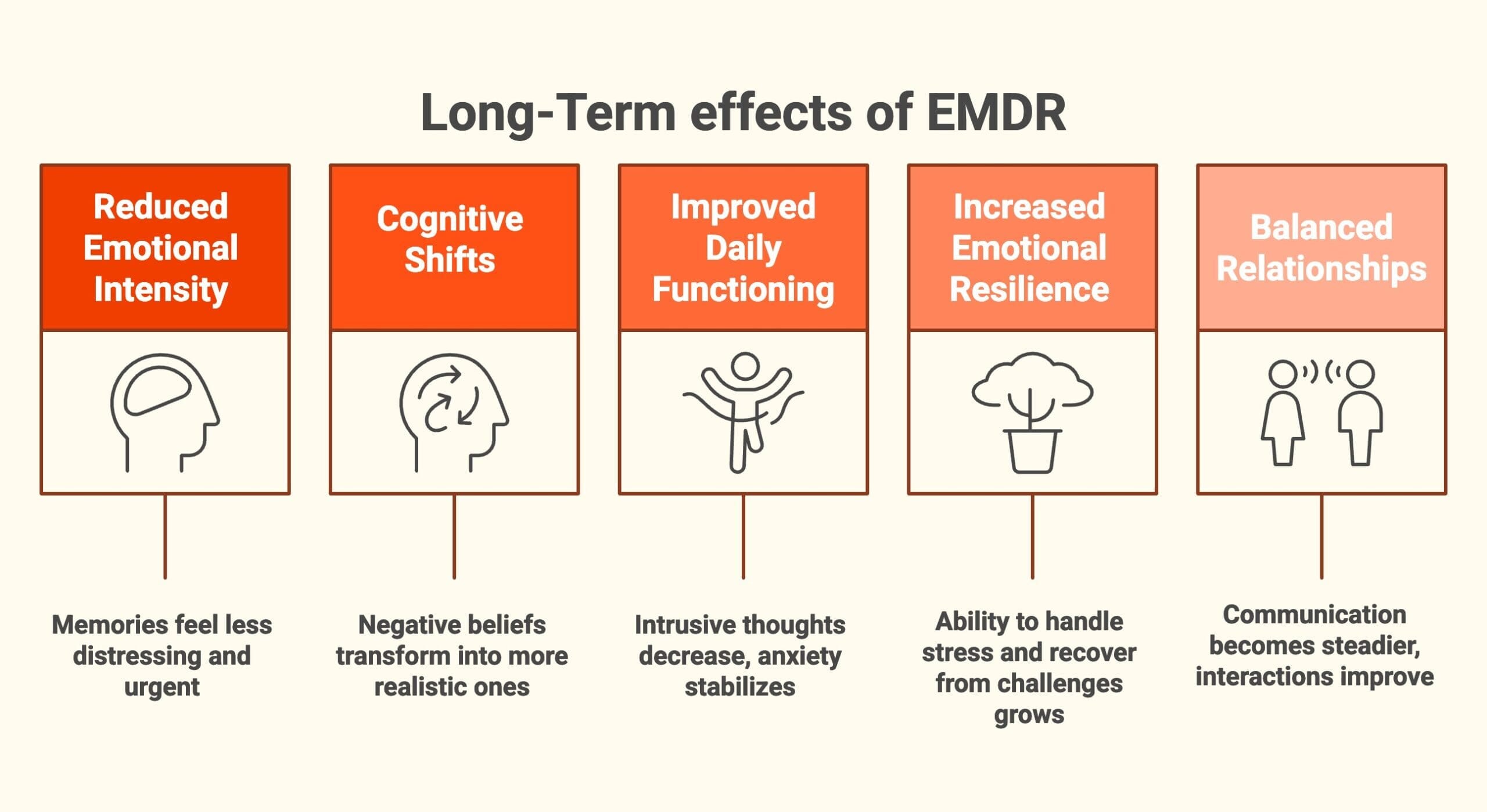 Long-term effects of EMDR tend to move in a positive direction. It appears as reduced emotional intensity, cognitive shifts, and improved daily functioning over multiple sessions.